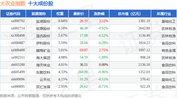 近10日内大农业(399814)指数成份股做了调整,新纳入了5只股票,剔除了5只股票。