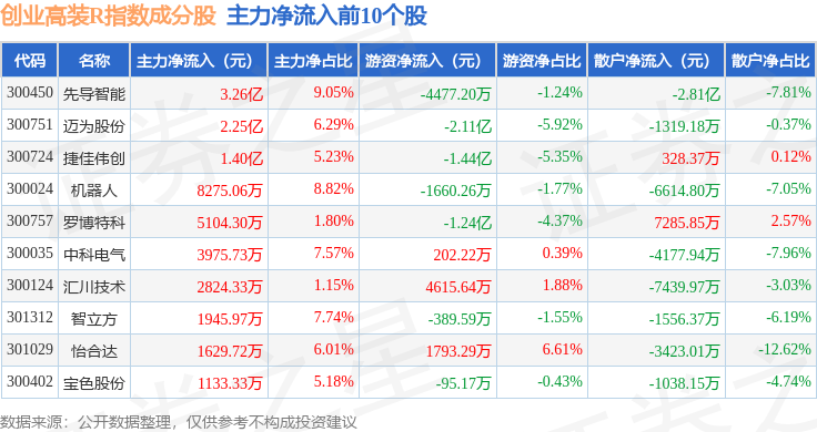 资金流向方面,创业高装R(470040)指数成份股当日主力资金净流出合计2371.14万元,游资资金净流出合计6.47亿元,散户资金净流入合计6.71亿元。成份股资金流向详情见下表: