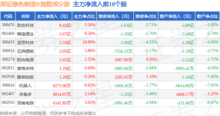 资金流向方面,深证绿色制造R(470069)指数成份股当日主力资金净流入合计10.41亿元,游资资金净流出合计5.43亿元,散户资金净流出合计4.97亿元。成份股资金流向详情见下表:
