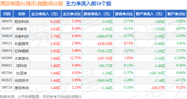 资金流向方面,湾区制造R(港币)(480010)指数成份股当日主力资金净流入合计14.3亿元,游资资金净流出合计7.57亿元,散户资金净流出合计6.73亿元。成份股资金流向详情见下表: