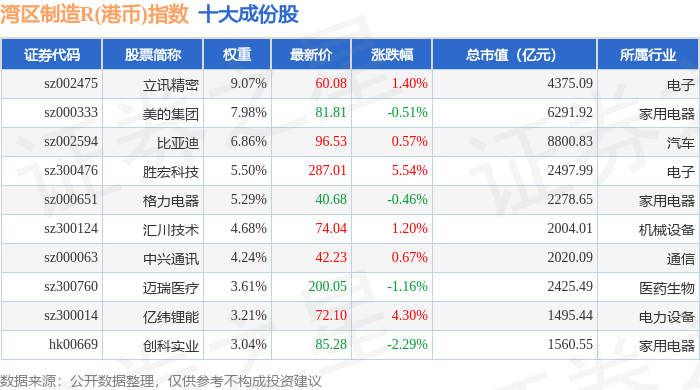 湾区制造R(港币)(480010)指数十大成份股详情如下: