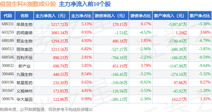 资金流向方面,疫苗生科R(480015)指数成份股当日主力资金净流出合计8.22亿元,游资资金净流入合计1.4亿元,散户资金净流入合计6.82亿元。成份股资金流向详情见下表: