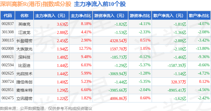 资金流向方面,深圳高新R(港币)(480039)指数成份股当日主力资金净流入合计18.64亿元,游资资金净流出合计3.34亿元,散户资金净流出合计15.3亿元。成份股资金流向详情见下表: