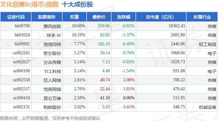 文化创意R(港币)(480047)指数十大成份股详情如下: