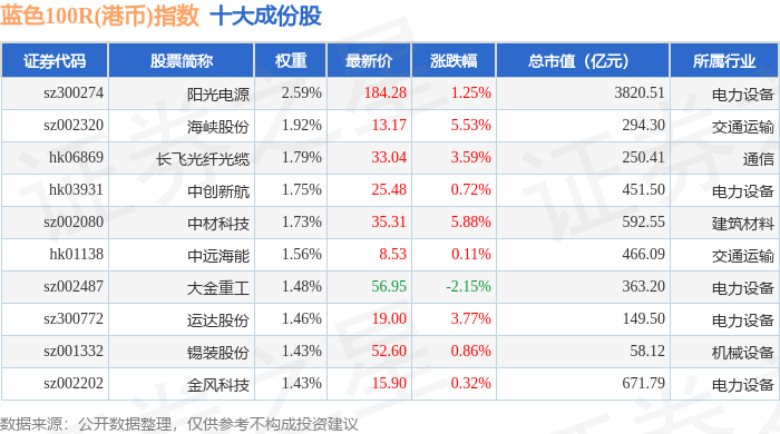 蓝色100R(港币)(480069)指数十大成份股详情如下: