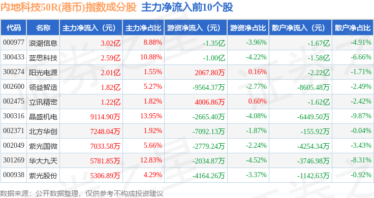 资金流向方面,内地科技50R(港币)(483004)指数成份股当日主力资金净流出合计2.54亿元,游资资金净流出合计5461.73万元,散户资金净流入合计3.09亿元。成份股资金流向详情见下表: