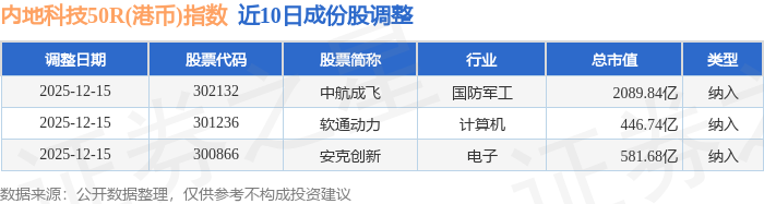 近10日内内地科技50R(港币)(483004)指数成份股做了调整,新纳入了3只股票。