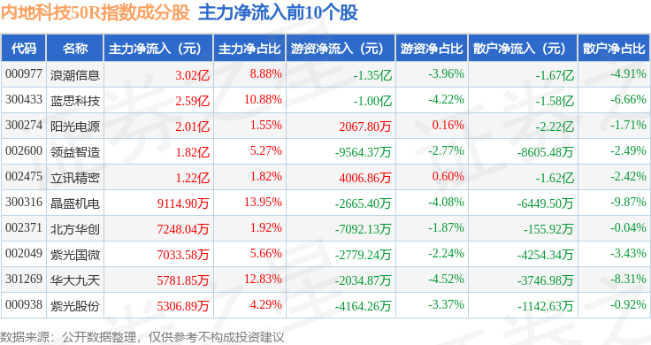 资金流向方面,内地科技50R(483003)指数成份股当日主力资金净流出合计2.54亿元,游资资金净流出合计5461.73万元,散户资金净流入合计3.09亿元。成份股资金流向详情见下表: