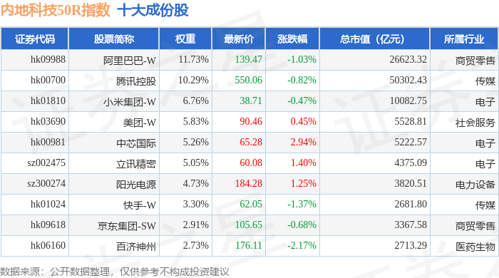 内地科技50R(483003)指数十大成份股详情如下: