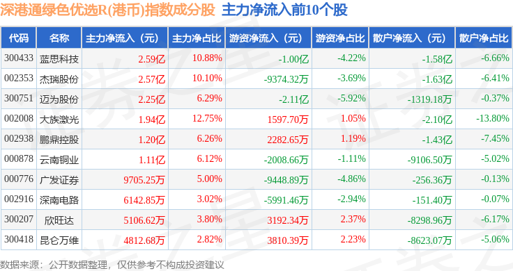 资金流向方面,深港通绿色优选R(港币)(483012)指数成份股当日主力资金净流出合计12.87亿元,游资资金净流入合计2.43亿元,散户资金净流入合计10.43亿元。成份股资金流向详情见下表: