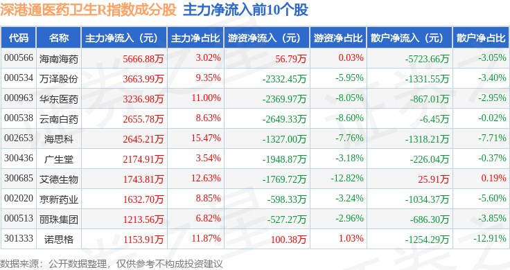 资金流向方面,深港通医药卫生R(483023)指数成份股当日主力资金净流出合计18.14亿元,游资资金净流入合计3.7亿元,散户资金净流入合计14.44亿元。成份股资金流向详情见下表: