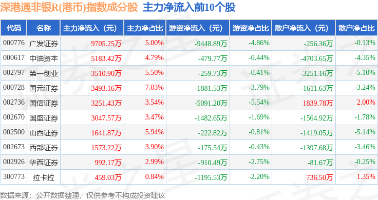 资金流向方面,深港通非银R(港币)(483054)指数成份股当日主力资金净流出合计3.46亿元,游资资金净流出合计2.5亿元,散户资金净流入合计5.96亿元。成份股资金流向详情见下表: