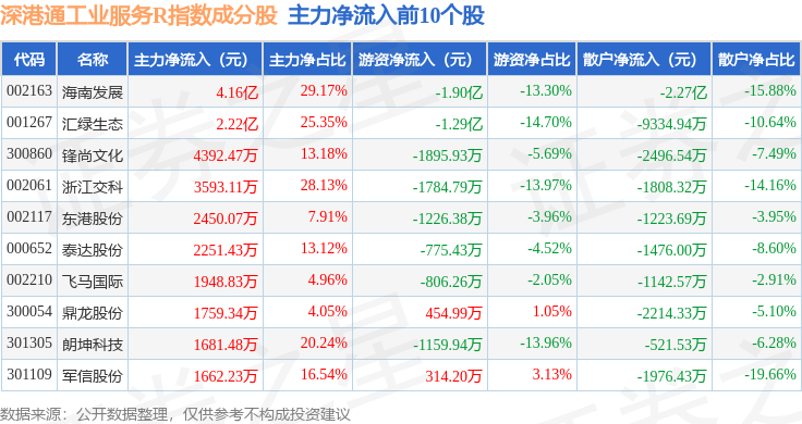 资金流向方面,深港通工业服务R(483055)指数成份股当日主力资金净流入合计2.51亿元,游资资金净流出合计2.1亿元,散户资金净流出合计4128.16万元。成份股资金流向详情见下表: