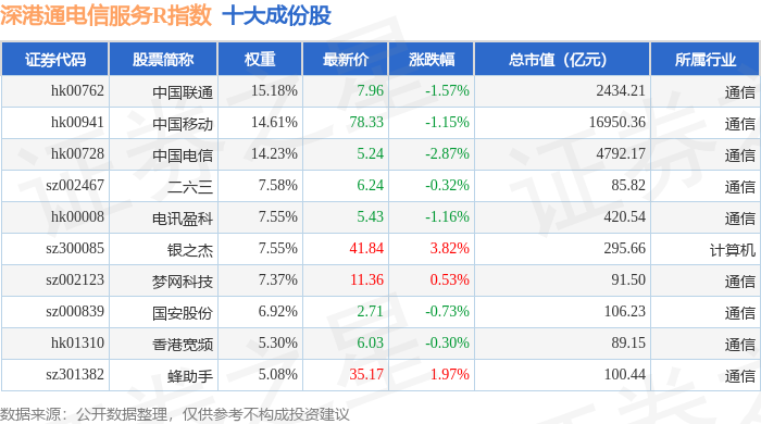 深港通电信服务R(483057)指数十大成份股详情如下: