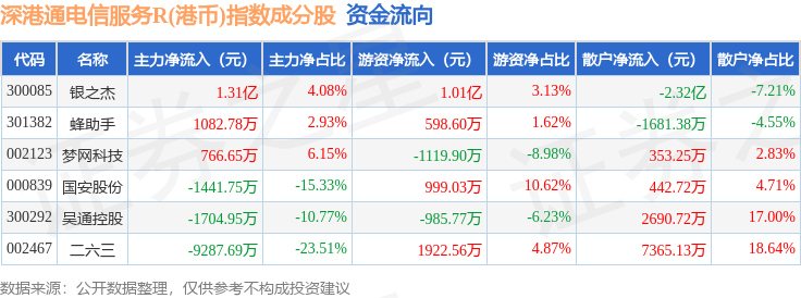 资金流向方面,深港通电信服务R(港币)(483058)指数成份股当日主力资金净流入合计2543.75万元,游资资金净流入合计1.15亿元,散户资金净流出合计1.4亿元。成份股资金流向详情见下表: