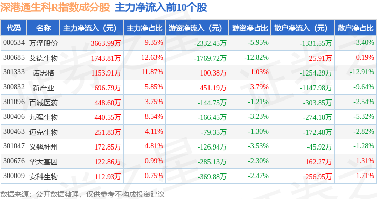 资金流向方面,深港通生科R(483059)指数成份股当日主力资金净流出合计1.42亿元,游资资金净流入合计1.01亿元,散户资金净流入合计4116.96万元。成份股资金流向详情见下表:
