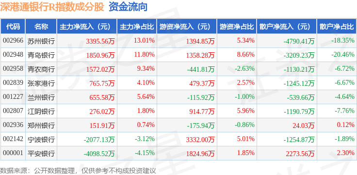 资金流向方面,深港通银行R(483081)指数成份股当日主力资金净流入合计2492.14万元,游资资金净流入合计8570.57万元,散户资金净流出合计1.11亿元。成份股资金流向详情见下表: