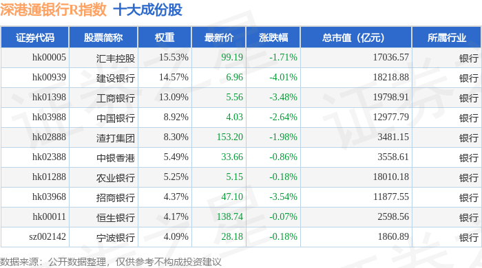 证券之星消息,12月8日,深港通银行R(483081)指数报收于12324.26点,跌1.94%,成交123.08亿元,换手率0.26%。当日该指数成份股中,下跌的有28家,建设银行以4.01%的跌幅领跌。