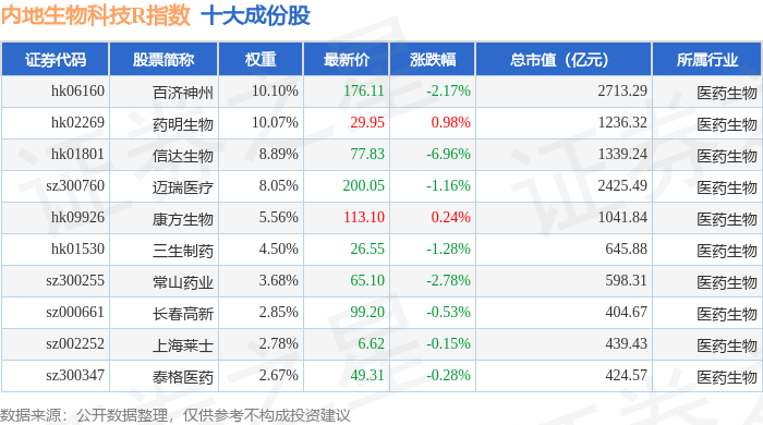 证券之星消息,12月8日,内地生物科技R(483101)指数报收于3327.02点,跌1.32%,成交168.34亿元,换手率0.93%。当日该指数成份股中,上涨的有11家,凯莱英以1.17%的涨幅领涨,下跌的有38家,信达生物以6.96%的跌幅领跌。