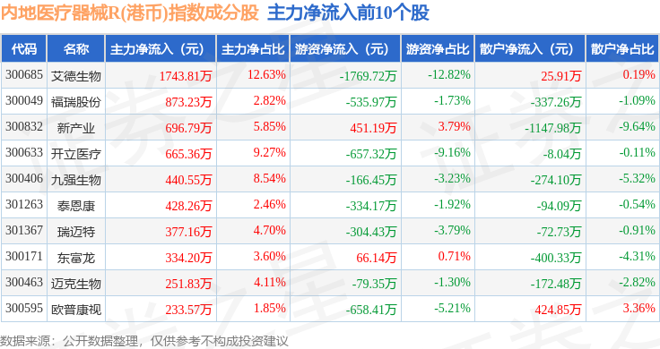 资金流向方面,内地医疗器械R(港币)(483104)指数成份股当日主力资金净流出合计1.87亿元,游资资金净流出合计5755.28万元,散户资金净流入合计2.45亿元。成份股资金流向详情见下表: