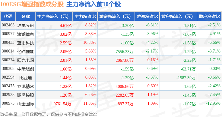 资金流向方面,100ESG增强(970033)指数成份股当日主力资金净流入合计2.69亿元,游资资金净流出合计3.8亿元,散户资金净流入合计1.1亿元。成份股资金流向详情见下表: