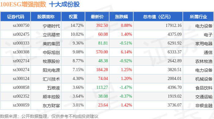 近10日内100ESG增强(970033)指数成份股做了调整,新纳入了6只股票,剔除了6只股票。