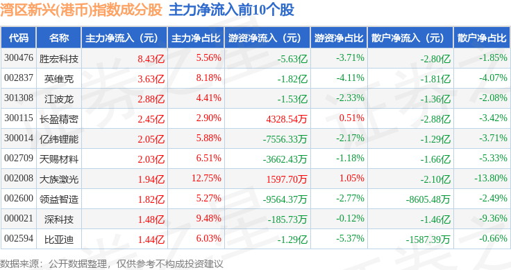 资金流向方面,湾区新兴(港币)(980008)指数成份股当日主力资金净流入合计18.77亿元,游资资金净流出合计8.3亿元,散户资金净流出合计10.47亿元。成份股资金流向详情见下表: