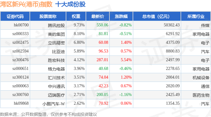 湾区新兴(港币)(980008)指数十大成份股详情如下: