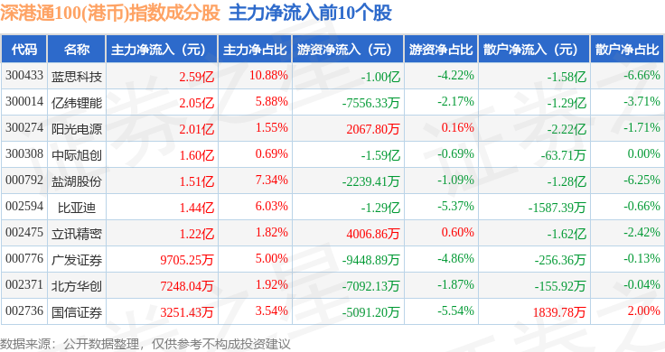 资金流向方面,深港通100(港币)(983008)指数成份股当日主力资金净流出合计22.41亿元,游资资金净流入合计6.92亿元,散户资金净流入合计15.49亿元。成份股资金流向详情见下表: