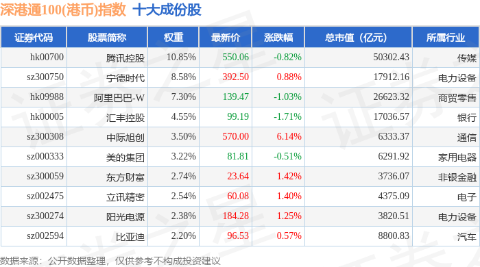 深港通100(港币)(983008)指数十大成份股详情如下: