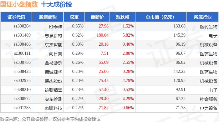 证券之星消息,12月8日,国证小盘(980202)指数报收于1772.71点,涨1.31%,成交1917.5亿元,换手率3.81%。当日该指数成份股中,上涨的有1094家,爱科赛博以20.0%的涨幅领涨,下跌的有368家,海泰发展以10.06%的跌幅领跌。