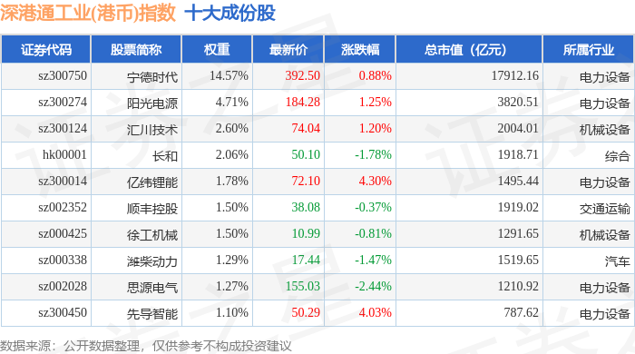 深港通工业(港币)(983018)指数十大成份股详情如下:
