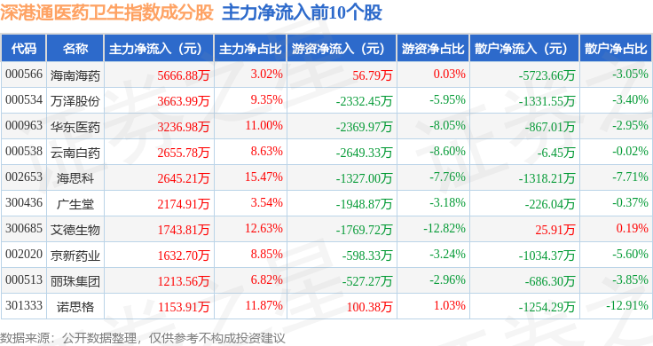 资金流向方面,深港通医药卫生(983023)指数成份股当日主力资金净流出合计18.14亿元,游资资金净流入合计3.7亿元,散户资金净流入合计14.44亿元。成份股资金流向详情见下表:
