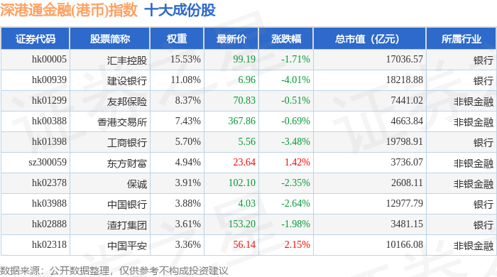 深港通金融(港币)(983026)指数十大成份股详情如下: