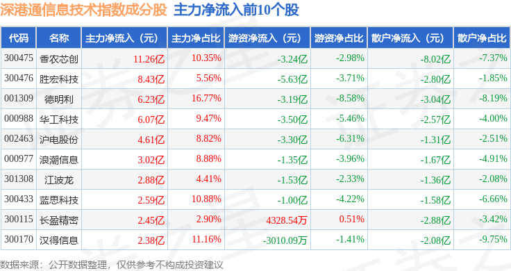 资金流向方面,深港通信息技术(983027)指数成份股当日主力资金净流入合计47.76亿元,游资资金净流出合计22.26亿元,散户资金净流出合计25.5亿元。成份股资金流向详情见下表: