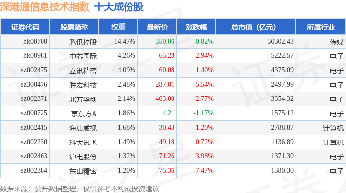 证券之星消息,12月8日,深港通信息技术(983027)指数报收于9445.4点,涨1.49%,成交2938.35亿元,换手率2.64%。当日该指数成份股中,上涨的有293家,荣科科技以20.0%的涨幅领涨,下跌的有73家,和而泰以3.93%的跌幅领跌。
