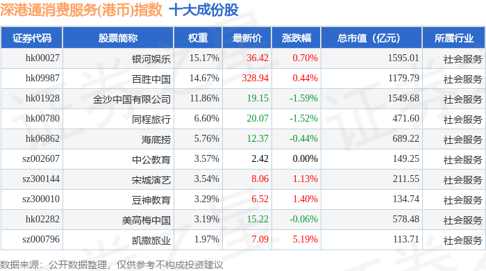 深港通消费服务(港币)(983046)指数十大成份股详情如下: