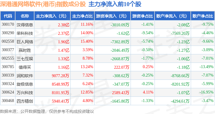 资金流向方面,深港通网络软件(港币)(983048)指数成份股当日主力资金净流入合计4.72亿元,游资资金净流入合计75.58万元,散户资金净流出合计4.73亿元。成份股资金流向详情见下表: