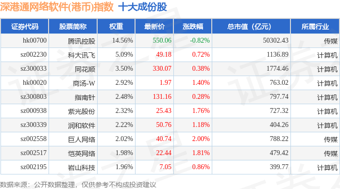 深港通网络软件(港币)(983048)指数十大成份股详情如下: