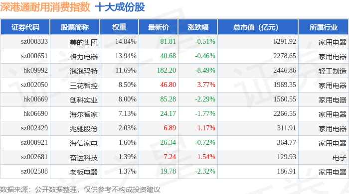 深港通耐用消费(983049)指数十大成份股详情如下: