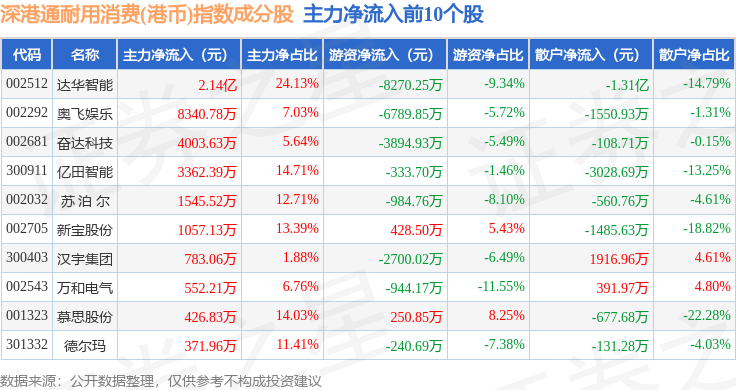 资金流向方面,深港通耐用消费(港币)(983050)指数成份股当日主力资金净流出合计1.99亿元,游资资金净流出合计444.16万元,散户资金净流入合计2.04亿元。成份股资金流向详情见下表: