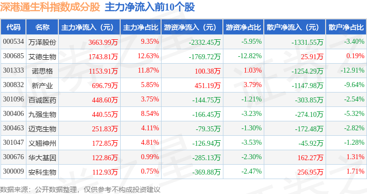 资金流向方面,深港通生科(983059)指数成份股当日主力资金净流出合计1.42亿元,游资资金净流入合计1.01亿元,散户资金净流入合计4116.96万元。成份股资金流向详情见下表: