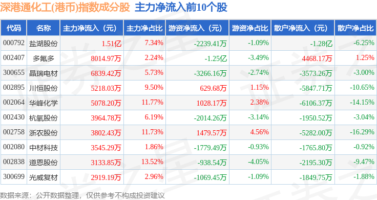 资金流向方面,深港通化工(港币)(983064)指数成份股当日主力资金净流出合计2.52亿元,游资资金净流入合计3.83亿元,散户资金净流出合计1.31亿元。成份股资金流向详情见下表: