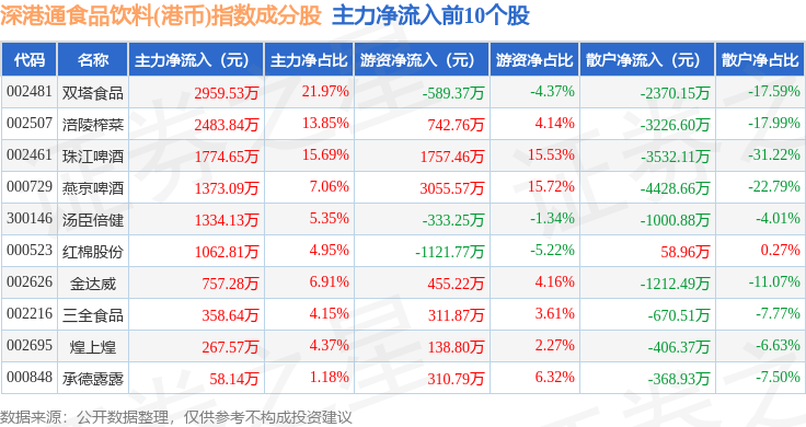 资金流向方面,深港通食品饮料(港币)(983066)指数成份股当日主力资金净流出合计12.53亿元,游资资金净流入合计4.93亿元,散户资金净流入合计7.6亿元。成份股资金流向详情见下表: