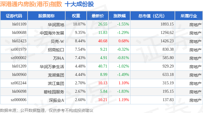 深港通内房股(港币)(983084)指数十大成份股详情如下: