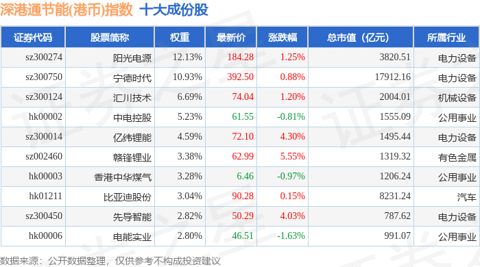 深港通节能(港币)(983086)指数十大成份股详情如下: