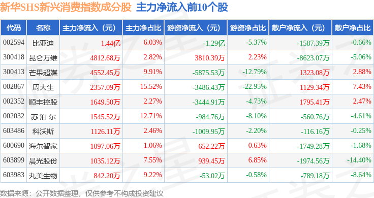 资金流向方面,新华SHS新兴消费(989006)指数成份股当日主力资金净流出合计3.44亿元,游资资金净流出合计6867.5万元,散户资金净流入合计4.13亿元。成份股资金流向详情见下表: