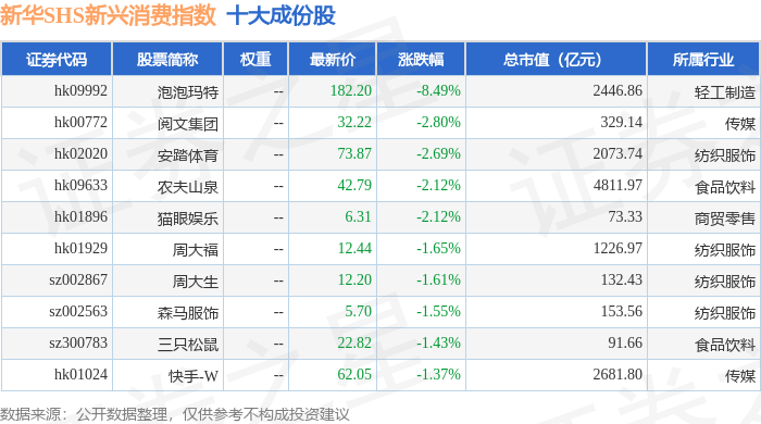 新华SHS新兴消费(989006)指数十大成份股详情如下: