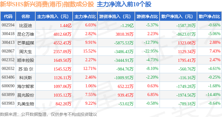 资金流向方面,新华SHS新兴消费(港币)(989007)指数成份股当日主力资金净流出合计3.44亿元,游资资金净流出合计6867.5万元,散户资金净流入合计4.13亿元。成份股资金流向详情见下表: