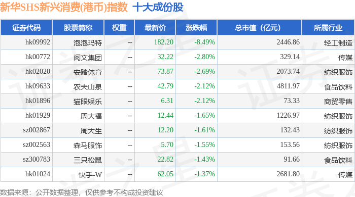 新华SHS新兴消费(港币)(989007)指数十大成份股详情如下: